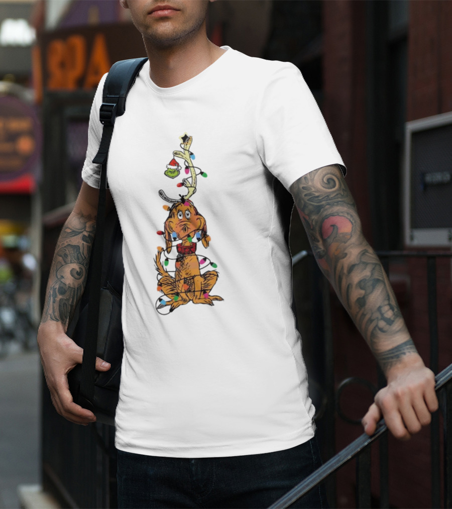 Funny Grinch Christmas Lights With Dog Wrapped In Colorful String Of Lights T-Shirt
