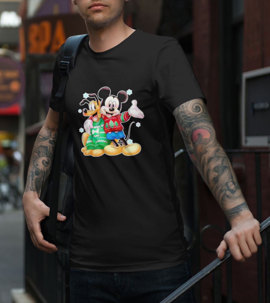 Mickey And Pluto Christmas Sweater Holiday Scene T-Shirt