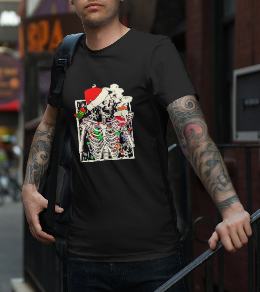 Skeleton Santa Hat Snowflake Christmas Coffee Candy Cane Holiday Scene T-Shirt