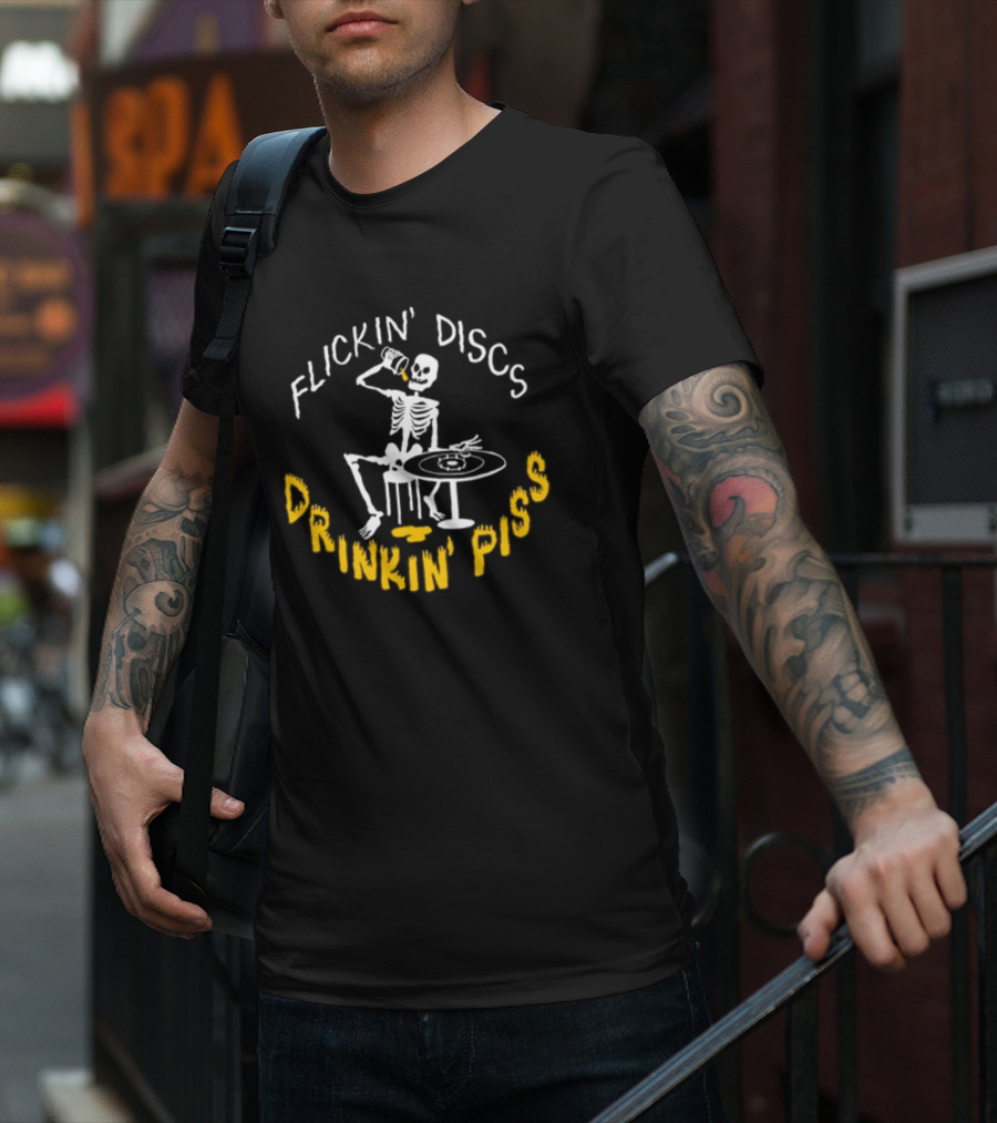Flickin Discs Drinkin Piss Skeleton Holding Bottle And Disc T-Shirt