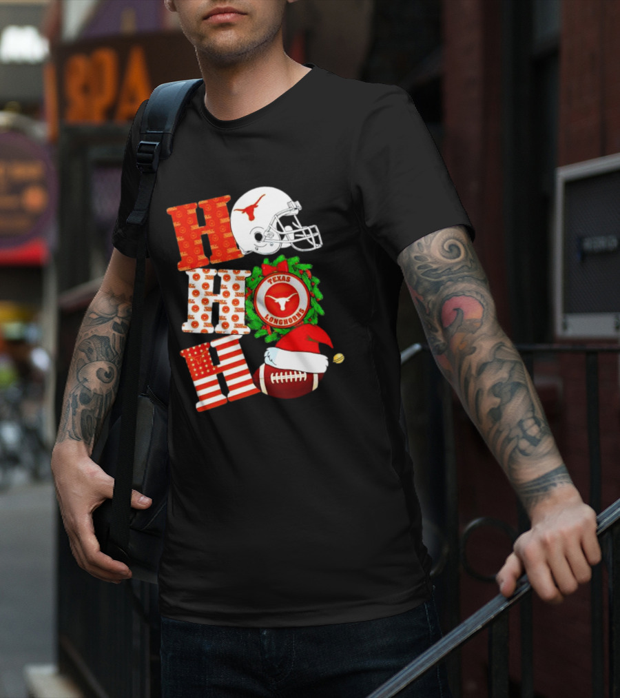 Texas Longhorns Ho Ho Ho Christmas Football Helmet Wreath Santa Hat T-Shirt