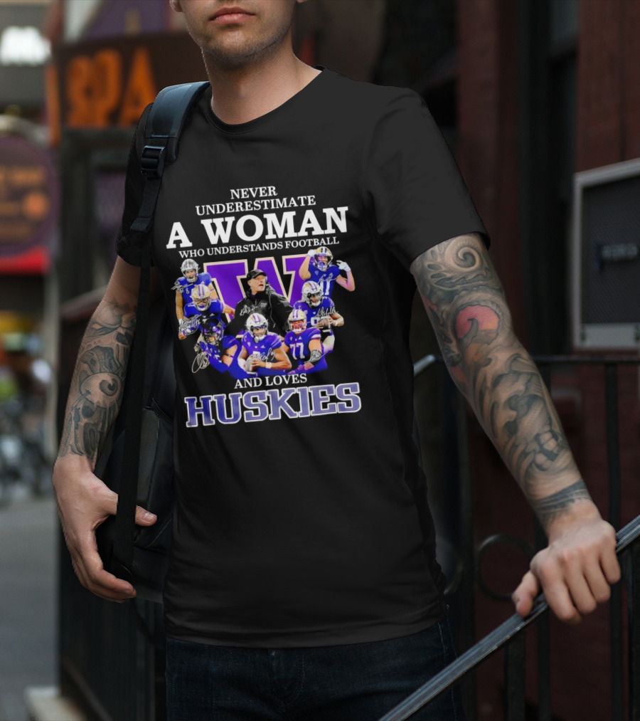 Never Underestimate A Woman Who Understands Football And Loves Huskies Washington Football Players Signatures T-Shirt