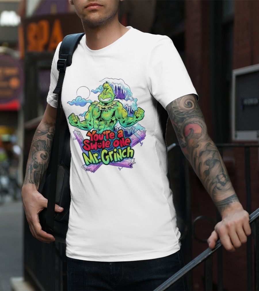 You’re A Swole One Mr Grinch Fitness Muskula Green Character With Frosted Mountain Background T-Shirt